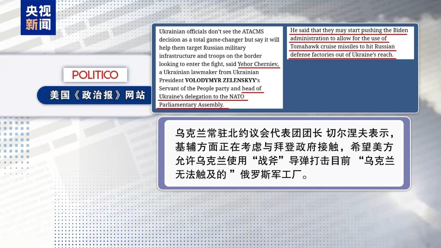 乌克兰常驻北约议会代表团团长切尔涅夫示意,基辅方面正在探究与拜登政府斗殴,但愿好意思方允许乌克兰使用“战斧”导弹打击面前 “乌克兰无法涉及的”俄罗斯军工场。他补充谈,乌克兰官员惦记,行将上台的特朗普政府可能会对批准此类授权愈加魂不守宅,而可能会将其“行动与俄罗斯东谈主谈判的筹码”。